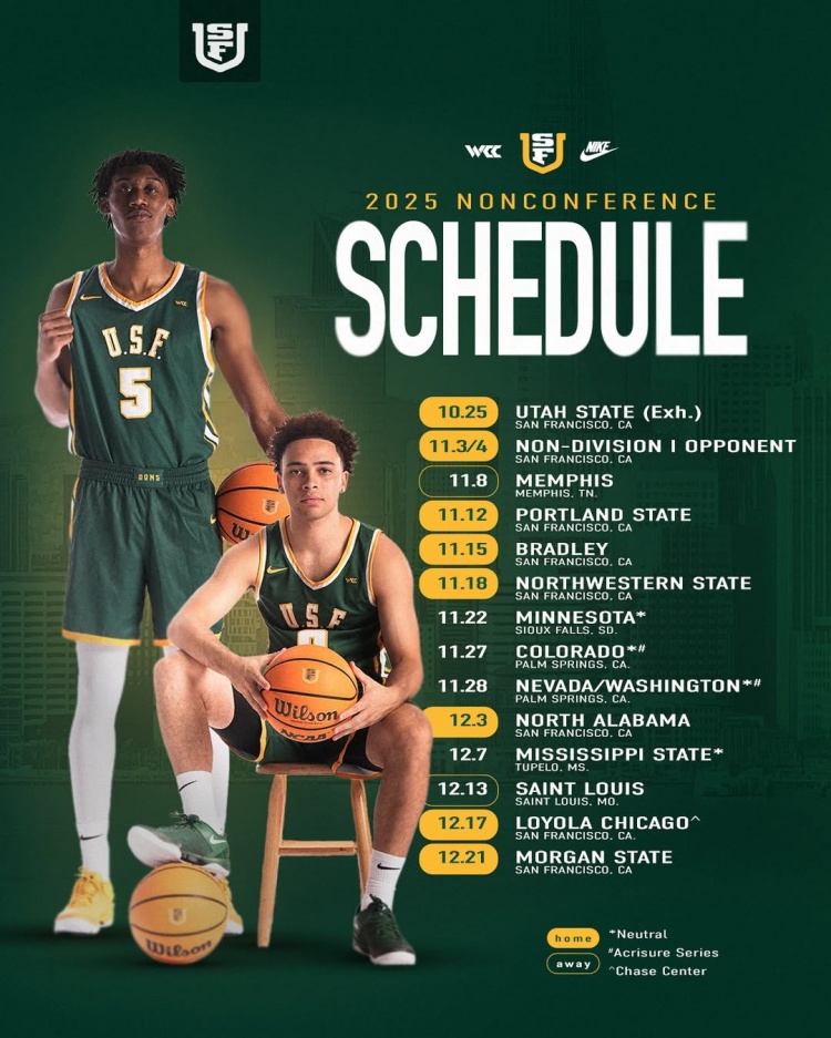 赛程显示,旧金山大学延续传统,赛季首战仍选择对阵非一级联盟队伍,而在客场赛事中将遭遇多支来自高水平联盟(主要为NCAA一级联盟)的劲旅。